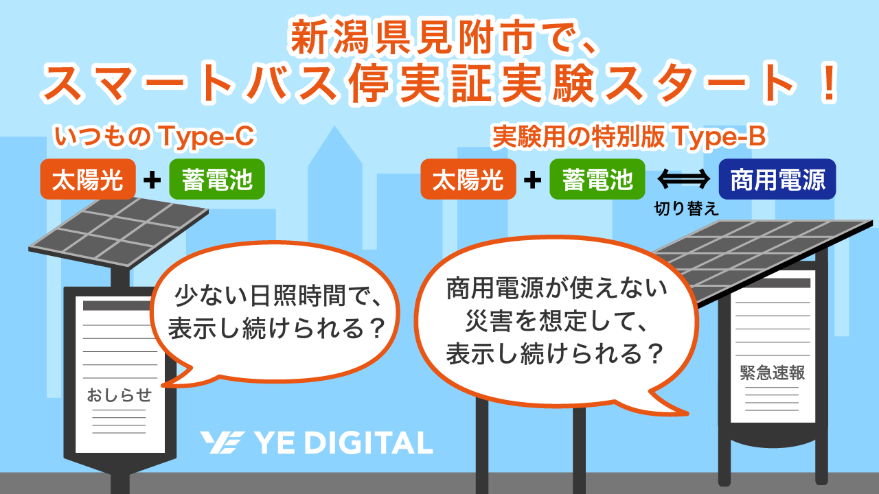 株式会社YE DIGITAL(※1、以下 YEデジタル)は、新潟県見附市が業務委託するランドブレイン株式会社(※2、以下 ランドブレイン)と連携し、西鉄エム・テック株式会社(※3、以下 西鉄エム・テック)と共同開発した「スマートバス停」を用いた『太陽光発電設備+蓄電池』を電源とする災害に強いバス停の実証実験を、見附駅前・見附高校前のバス停にて2022年12月1日(木)より開始いたしました。