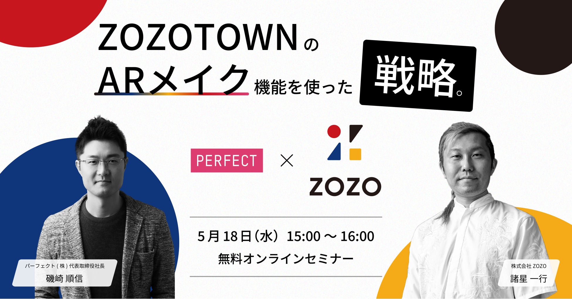 パーフェクト株式会社は、5月18日(水)15時より、「ZOZOTOWNのARメイク機能を使った戦略」をテーマに、株式会社ZOZOより、「ZOZOTOWN」へAR技術導入の舵を取った諸星氏を招待し、無料オンラインビジネスセミナーを開催致します。