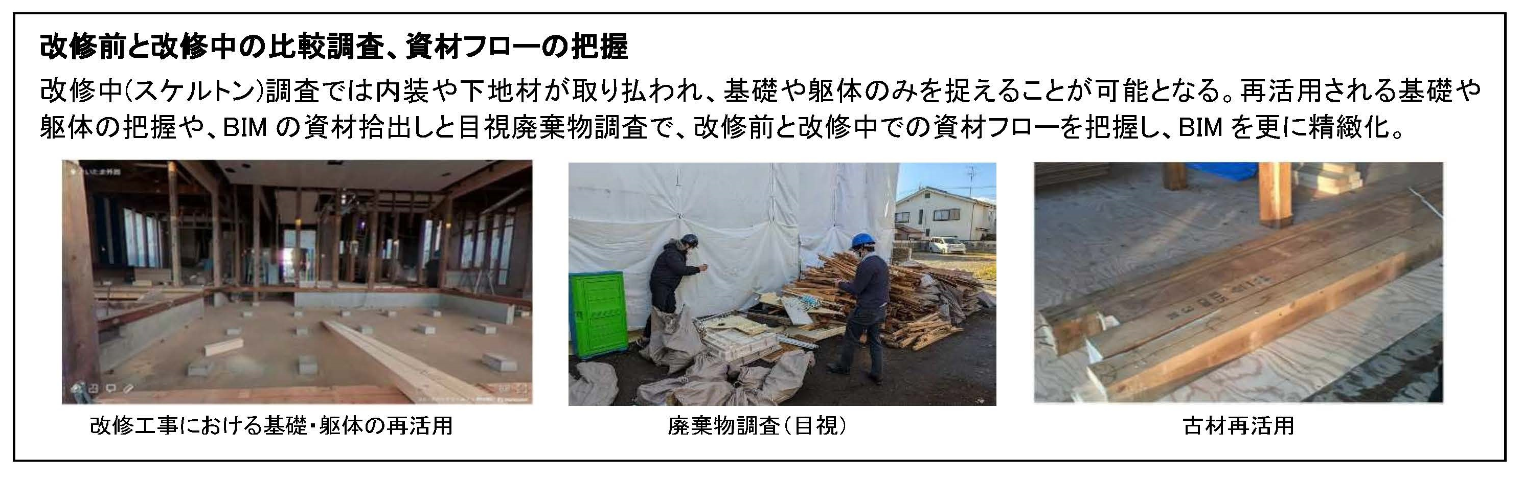 建物改修における、①産業廃棄物の抑制、②新規資材投入量の削減、③それに伴う生産・運搬等に要するエネルギーの削減、等が定量化されることによりCO2排出量削減効果が可視化されます。更に30年サイクルで建替えを繰り返した場合と、改修によって維持された場合の建物LCA(ライフサイクルアセスメント)評価システムの構築を進めます。