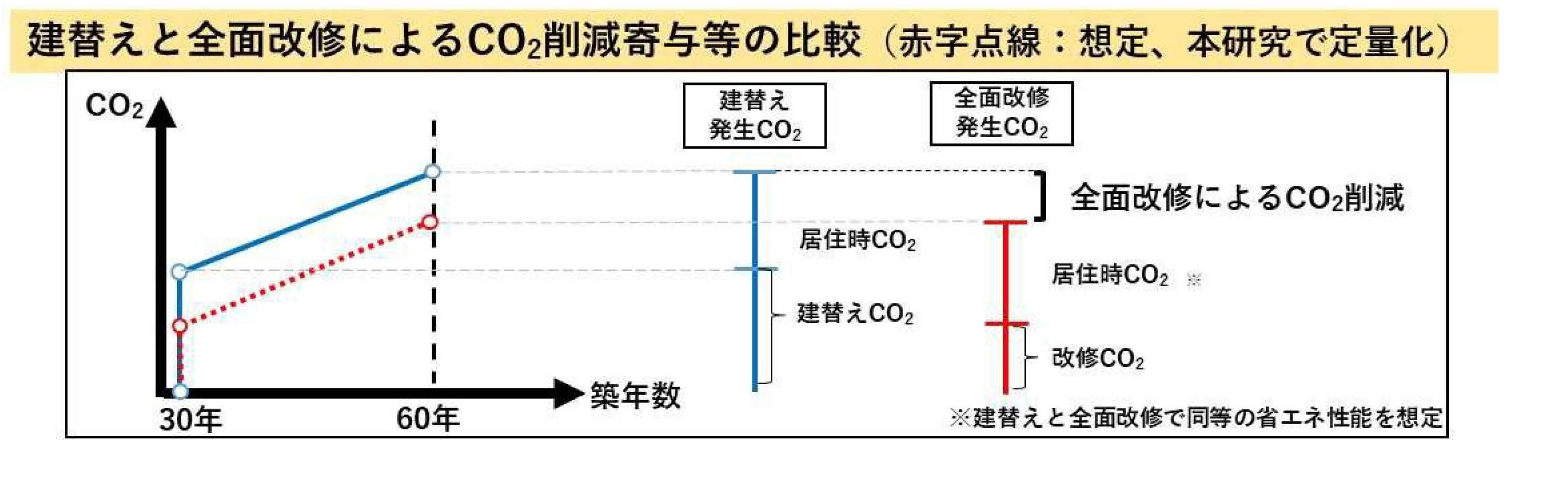 2050年までにCO2排出を実質ゼロにすることを目指す、脱炭素社会に向けた取り組みが社会全体で求められています。既存住宅の改修においては、全てを撤去し一から組み上げる「新築建替え」よりも、基礎や骨組みなどを再活用して「全面改修」を行う方が廃棄物の発生や資源投入量が少なく“省資源”かつ“省CO2”であると推測できますが、定量的な分析はこれまで行われていない状況でした。