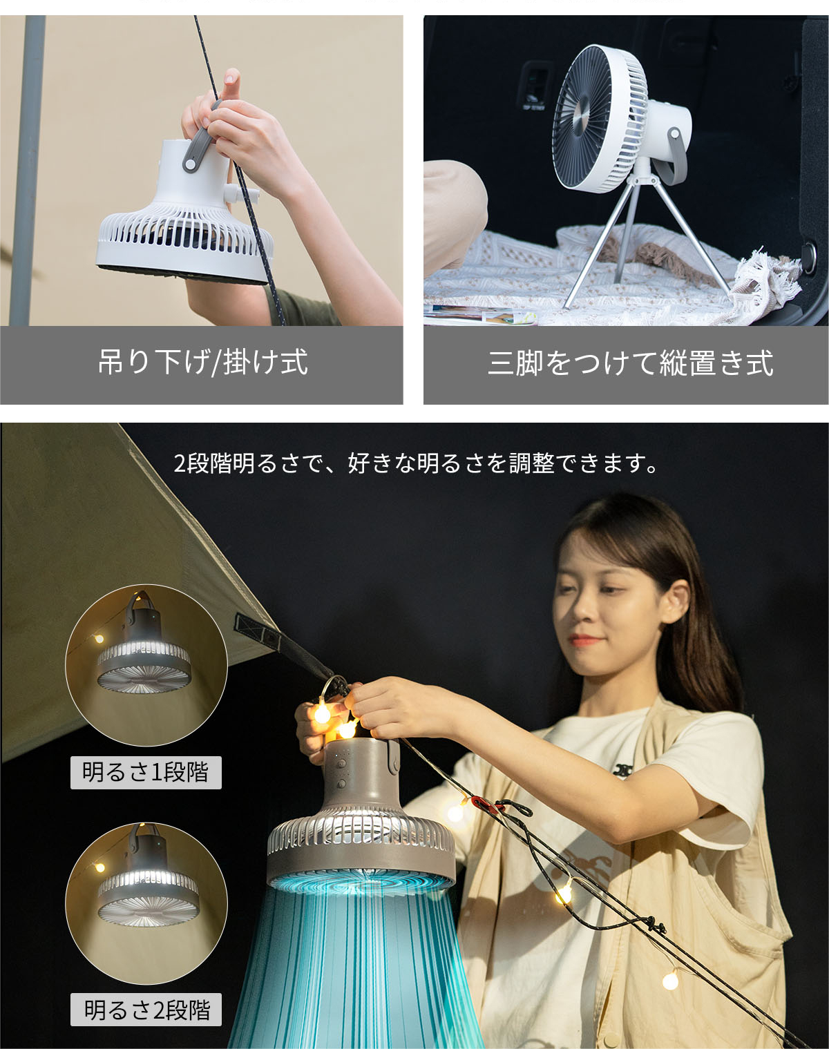 ホワイト・グレー色の多機能ワイヤレスファンで、アウトドア、車中泊、室内用、オフィスなど様々なシーンに夏を涼しく過ごせます。