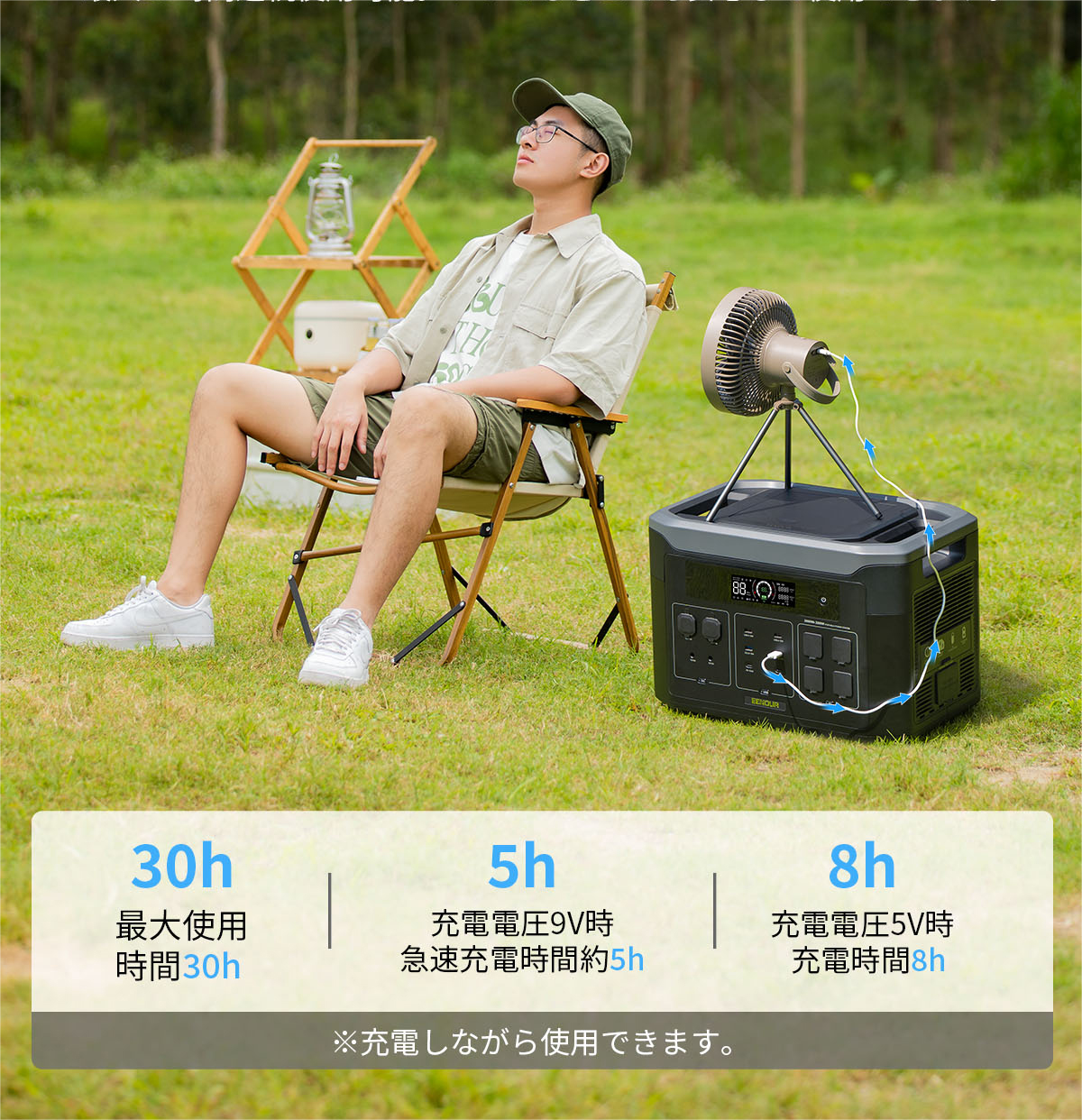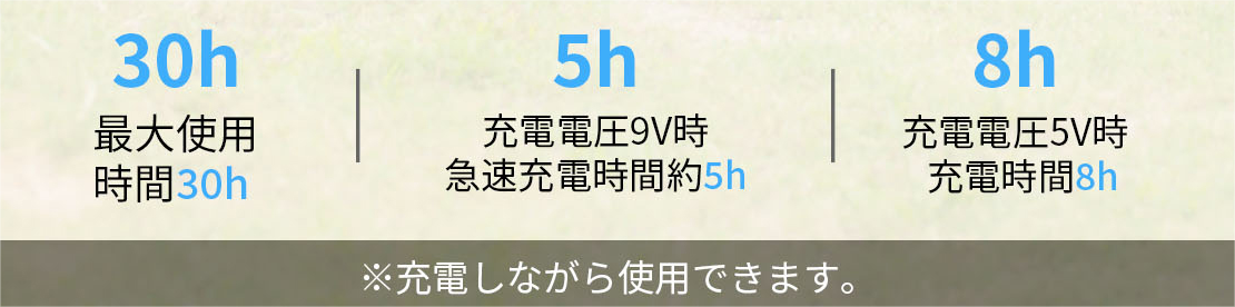 10000mAh大容量のバッテリーが内蔵、最大30h連続使用可能、電気がないアウトドアでも、気楽に使用できます。また、Type-Cポートを採用、急速充電も対応しており、約5~6時間だけで充電満タンになります。
