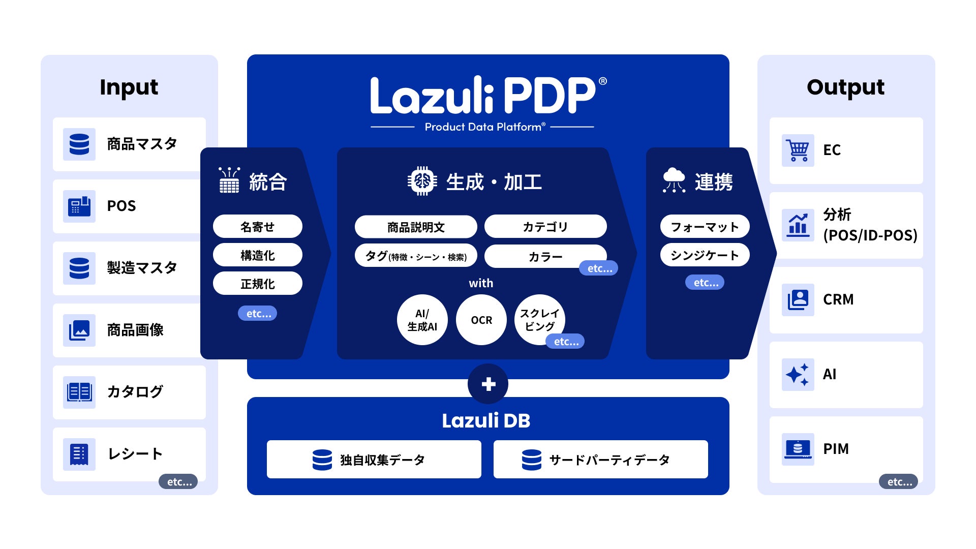 Lazuliが開発、提供する「Lazuli PDP」は、複数の外部データベースに点在していた商品情報を一括して管理し、データを活用しやすい形に整備、連携するためのプラットフォームです。製造業者や小売業者などが保有する多様な商品マスタデータを、AIを活用して名寄せし、製品の特徴や利用シーンからメタタグの付与や関連付けを行います。これらの情報が「Lazuli PDP」を通じて、各種ツールに自動連携されます。