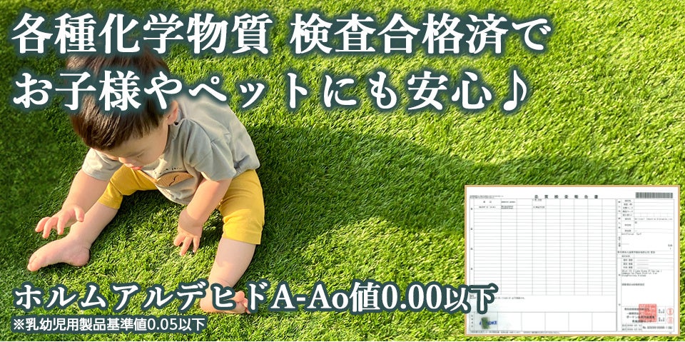 当店の人工芝シリーズはホルムアルデヒド検査し、お子さまにも安心して芝の上で遊んでもらえる事を確認しております。