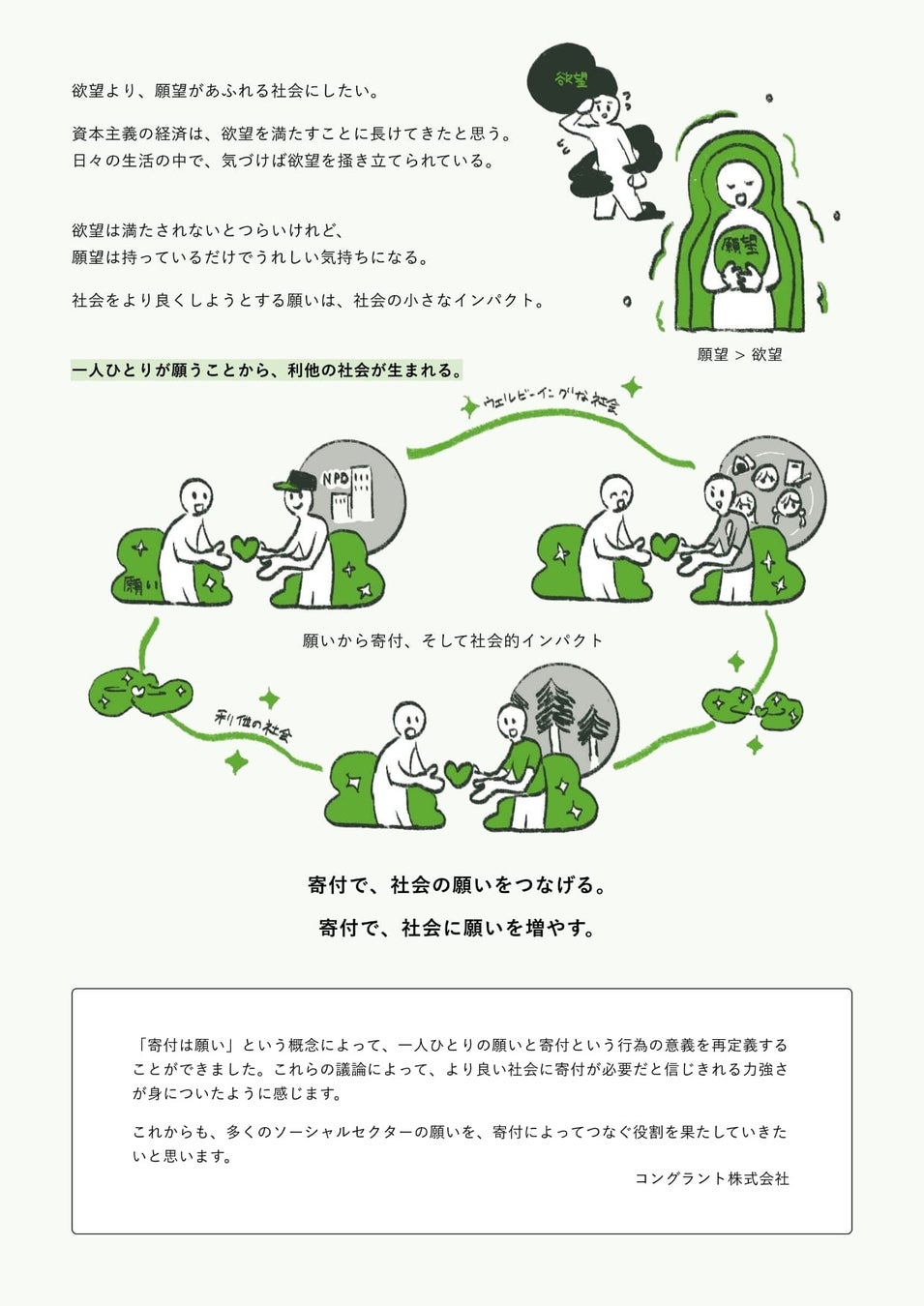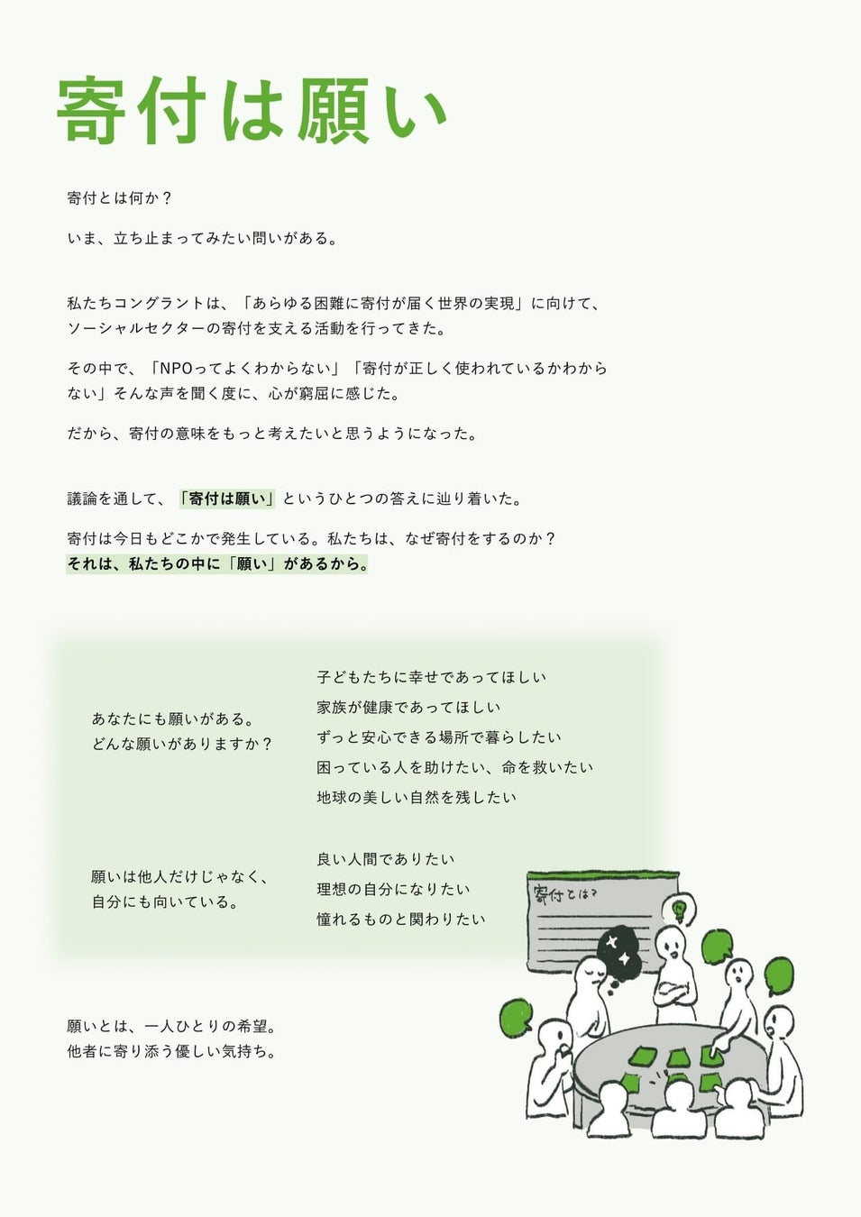 私たちコングラントは、これまで多くのNPO・ソーシャルセクターの寄付集めをサポートしてきました。その中でふとした時に感じさせられる「寄付とは何か?」という問いに対し、ワークショップを通じて「寄付は願い」という答えに辿り着きました。
