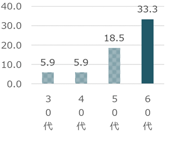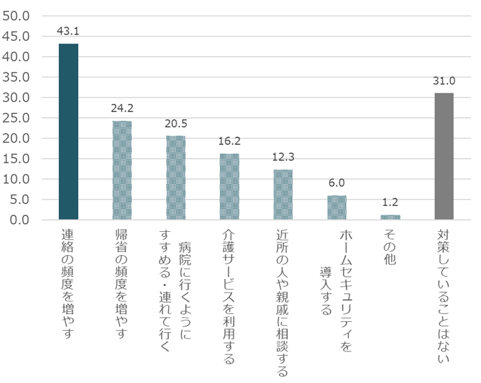 何かしらの不安を感じている人に具体的な対策を聞くと、「連絡の頻度を増やす」(43.1%)が最も多く、31.0%は「対策していることはない」と回答しました【図2-1】。なお、「介護サービスを利用する」(16.2%)と回答した人を年代別に見ると、60代が33.3%と30代・40代(5.9%)の5倍以上で、年代が上がるにつれて介護サービスの利用が増える傾向を確認できました【図2-2】。