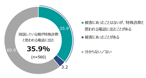 なお、別居している親が特殊詐欺の被害にあった経験の有無を聞くと、35.9%が「被害にあったことはないが、特殊詐欺と思われる電話に出たことがある」と回答し、実際に「被害があったことがある」という人も3.2%で危機が身近に迫っていることがみてとれます【図5】。
