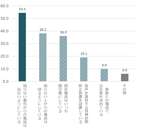 対策としては、空き巣や強盗と同様に「家に入れさせない」ことが重要で、具体的には「電話に出ない」「話を聞かない」ことが有効です。実際、別居している親が特殊詐欺の被害にあわないよう対策をしていると答えた人のなかで最も多いのは「知らない番号からの電話は出ないようにしている」(54.4%)であり、対策として浸透しつつあると読み取れます。
