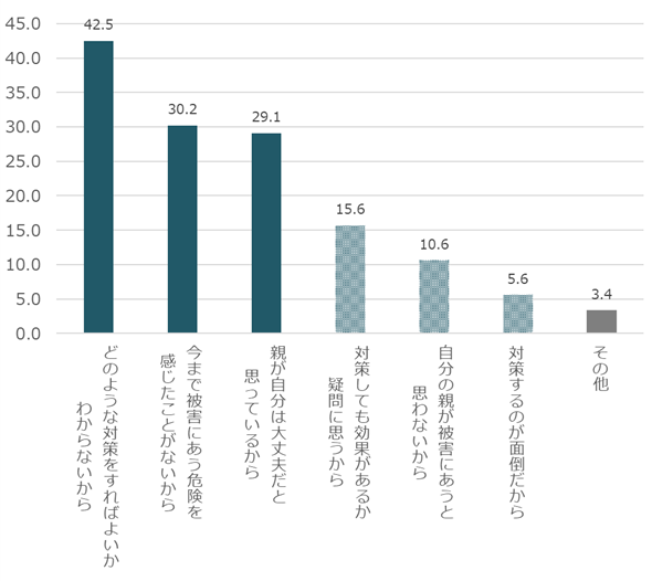 対策をしていない人の理由は、1位「どのような対策をすればよいかわからないから」(42.5%)、2位「今まで被害にあう危険を感じたことがないから」(30.2%)、3位「親が自分は大丈夫だと思っているから」(29.1%)となりました【図7】。