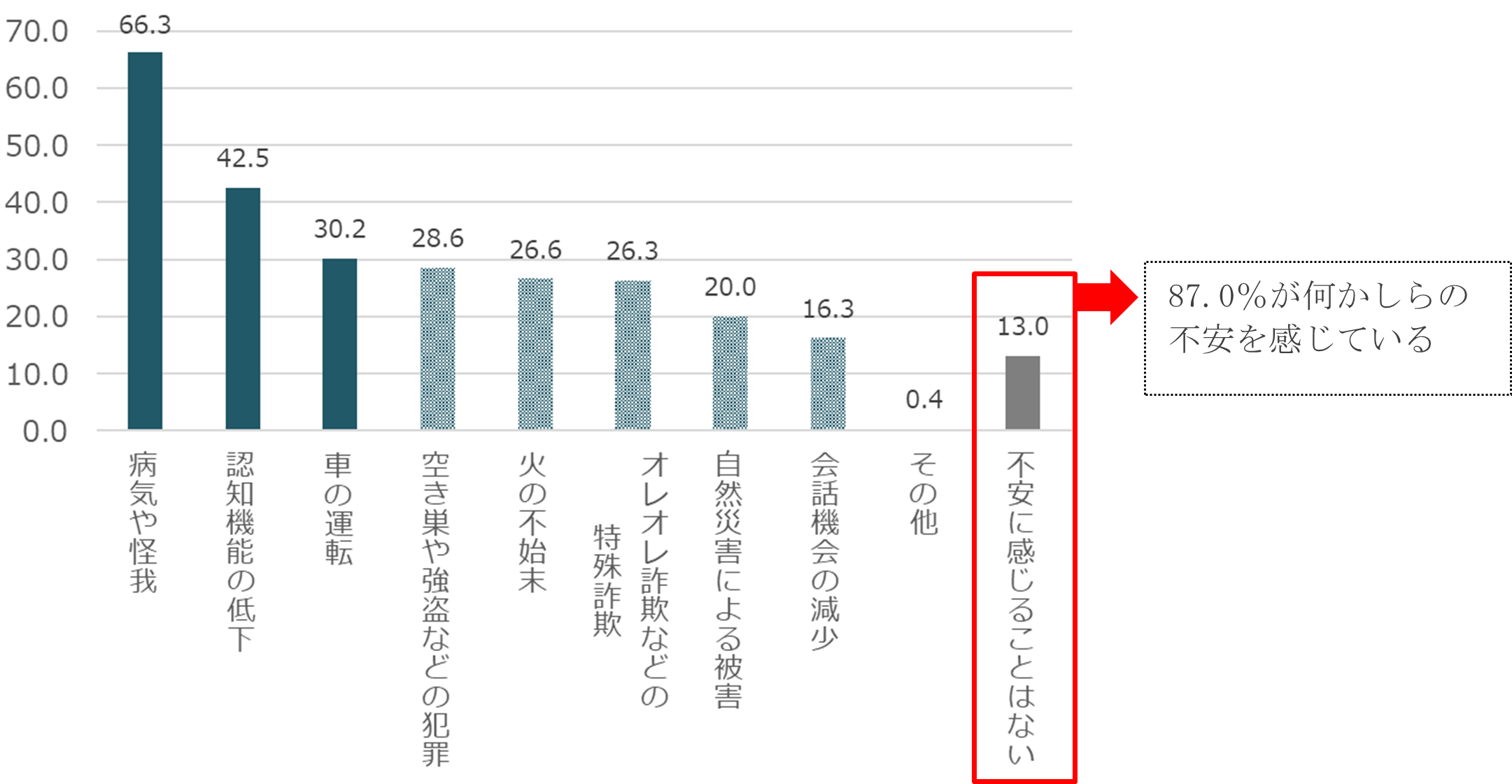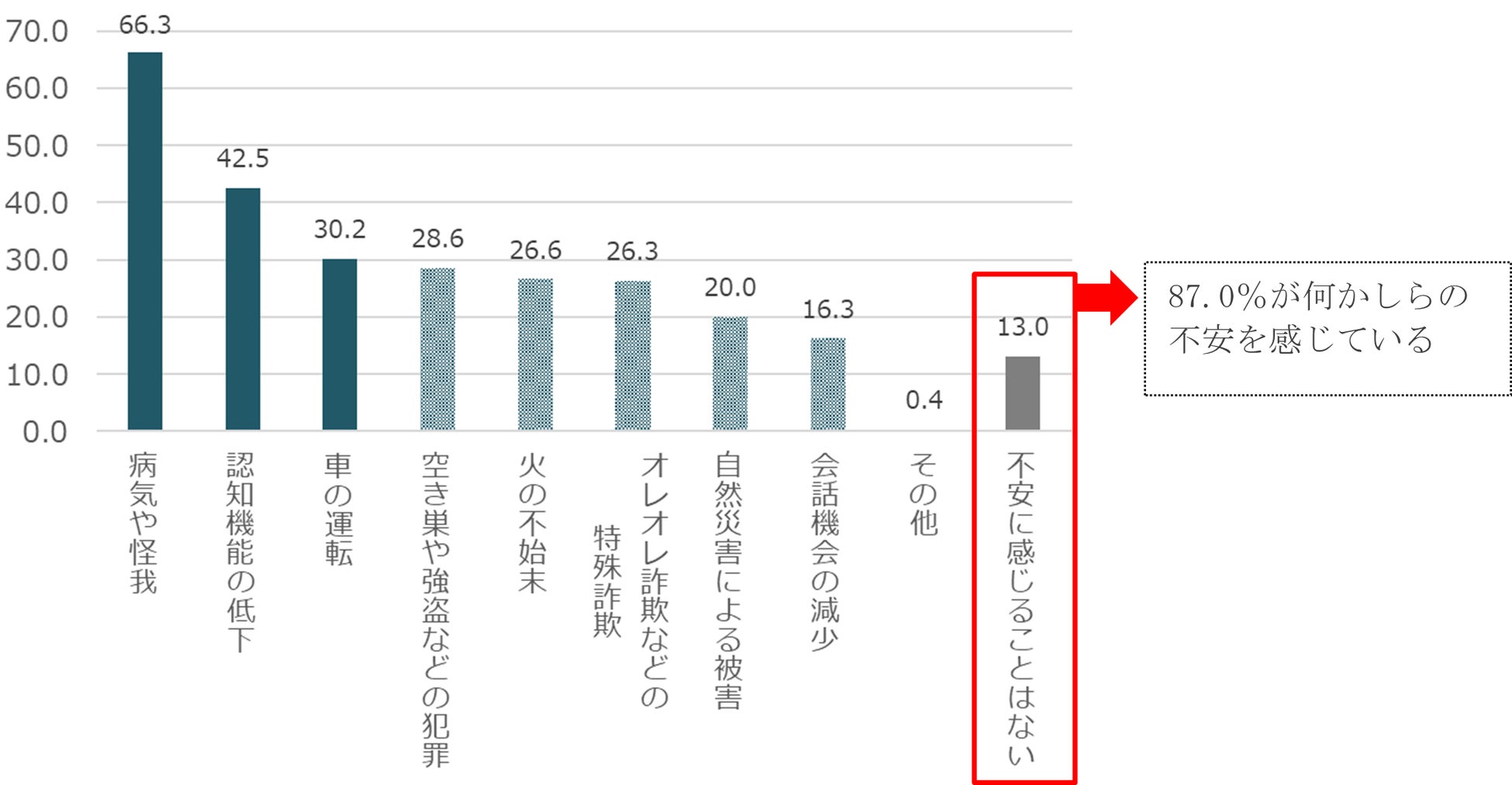 別居している親の暮らしに不安を感じている人は87.0%で、その内容のトップ3は1位「病気や怪我」(66.3%)、2位「認知機能の低下」(42.5%)、3位「車の運転」(30.2%)という結果でした【図1】。