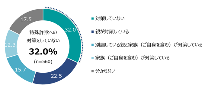 別居している親が特殊詐欺の被害にあう不安を感じている人は全体の56.0%(「感じている」(18.0%)、「どちらかと言えば感じている」(38.0%)の合計)【図3】に上る一方、32.0%は何も対策をしていないことが明らかになりました【図4】。