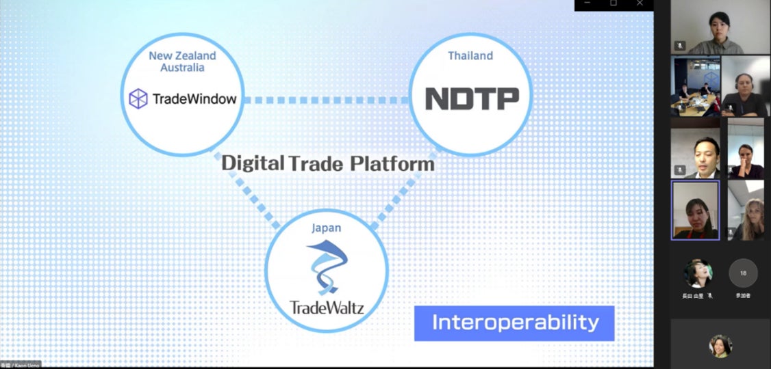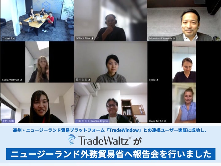日本貿易プラットフォーム「TradeWaltz®」は豪州・ニュージーランド貿易プラットフォーム「TradeWindow」との連携ユーザー実証に成功し、ニュージーランド外務貿易省へ報告会を行いました。