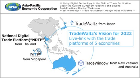 トレードワルツは、ニュージーランドで開催されたAPEC2021のワークショップにおいて、タイ・シンガポール・豪州・ニュージーランドの4カ国と貿易PFを接続し、情報をやりとりできる5カ国連携構想を発表し、経産省「インド太平洋サプライチェーン強靭化事業」として1年間の開発を進めてきました。