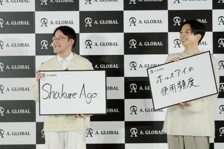 続いて、フリップを用いてのトークセッションでは、A. GLOBALの「え、ぐ、ろ、う、ば、る」という頭文字をつかって、新社名に込められた魅力をあいうえお作文で披露しました。河井さんは「エイジングケアには欠かせない、グッドで、ロイヤルなアイテムで、美しくなって、バリ、ルンルン」と披露。次に稲田さんは「ええやんこれ、グッドやん、老若男女も、嬉しいやん、バラ色の人生こっちにおいで、る〜るるるるるる」と披露し、会場の笑いを誘いました。続いて、これだけは負けない「GLOBAL」1位!ということは?の披露に移ると「ザ・ホルスアイ(The Horuseye)の使用頻度」と書いた河井さんは「歯ブラシの使用頻度と一緒でどこ行っても使ってるのでガチで書かせていただきました。」と美容男子として自信満々に答えました。「Shakure Ago」と書いた稲田さんは「 A. GLOBALの製品のおかげで私は顔を手に入れました。」と自身の顔をいじっていました。