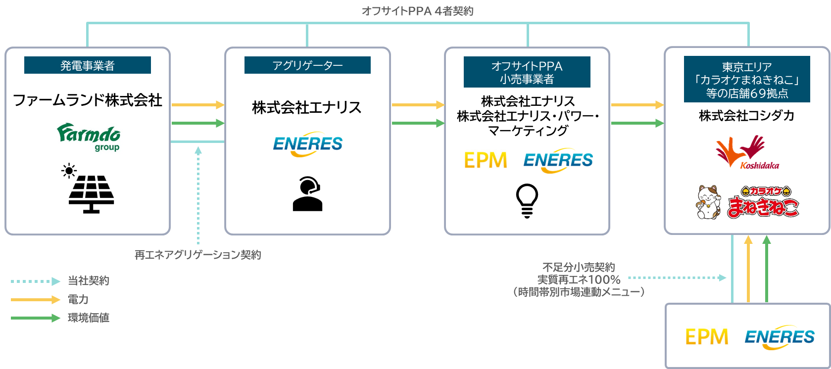 株式会社コシダカ(東京本社:東京都渋谷区、代表取締役社長 腰髙博、以下「コシダカ」)、ファームランド株式会社(群馬県前橋市、代表取締役 岩井雅之、以下「ファームランド」)、株式会社エナリス(東京都千代田区、代表取締役社長 都築実宏、以下「エナリス」)および株式会社エナリス・パワー・マーケティング(東京都千代田区、代表取締役 内田泰裕、以下「EPM」)は、コシダカが展開する「カラオケまねきねこ」等の東京エリア69拠点へ追加性のある再生可能エネルギー(以下、再エネ)を供給するオフサイトPPA[1]契約を締結しました。2025年10月15日より供給を開始します。
