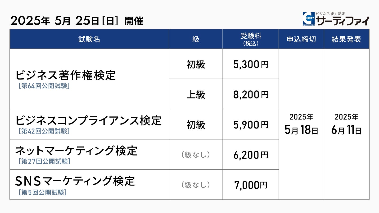 株式会社サーティファイ(本社:東京都中央区、代表取締役:瀧澤茂、以下「サーティファイ」)は、2025年5月25日(日)に開催する「ビジネス著作権検定」「ビジネスコンプライアンス検定」「ネットマーケティング検定」「SNSマーケティング検定」の公開試験の申込受付を2025年3月11日より開始しました。