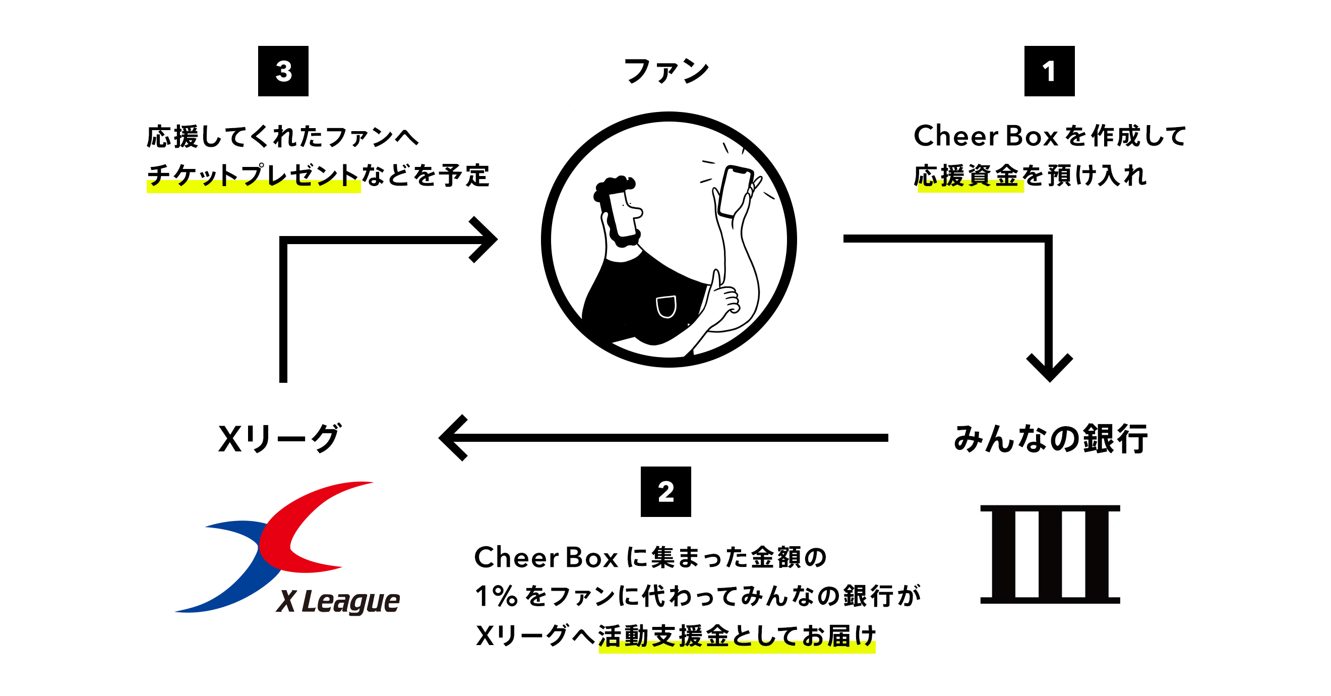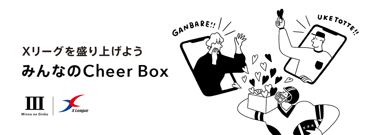 「アメフト」の4文字を含む名前を付けたCheer Boxにお金を預けていただくことで、みんなの銀行がファンの皆さまに代わって、Cheer Box預金残高の1%を「Xリーグ」にお届けします。