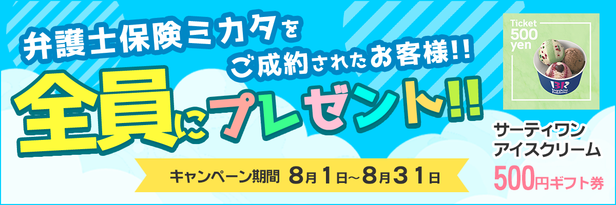 【弁護士保険比較】「弁護士保険ミカタ」ご成約で「サーティワン アイスクリーム 500円ギフト券」もれなくプレゼント【8月限定キャンペーン】
