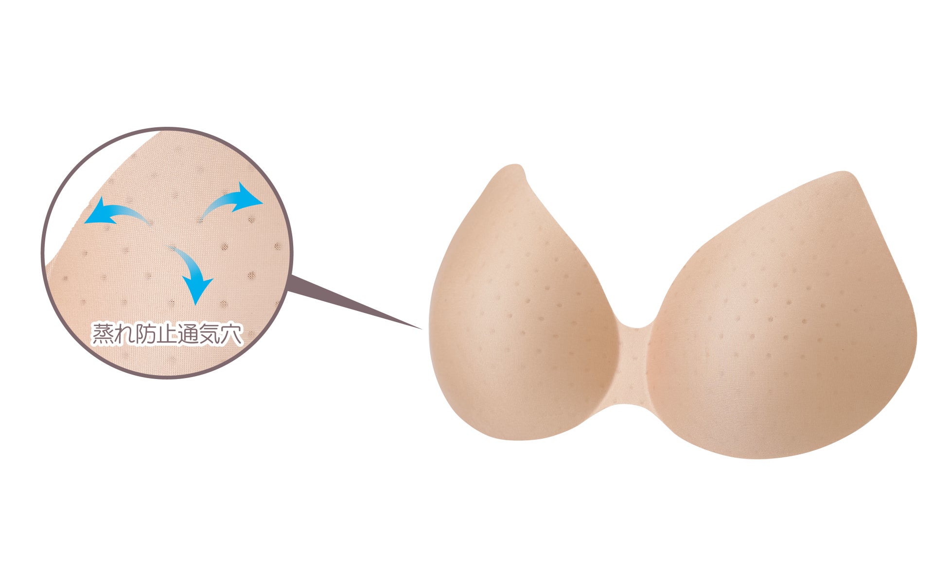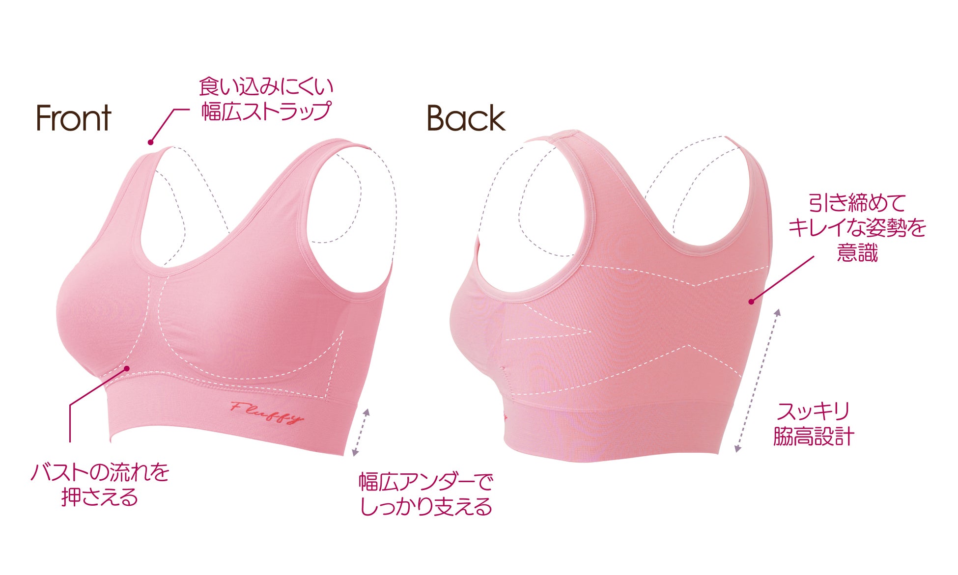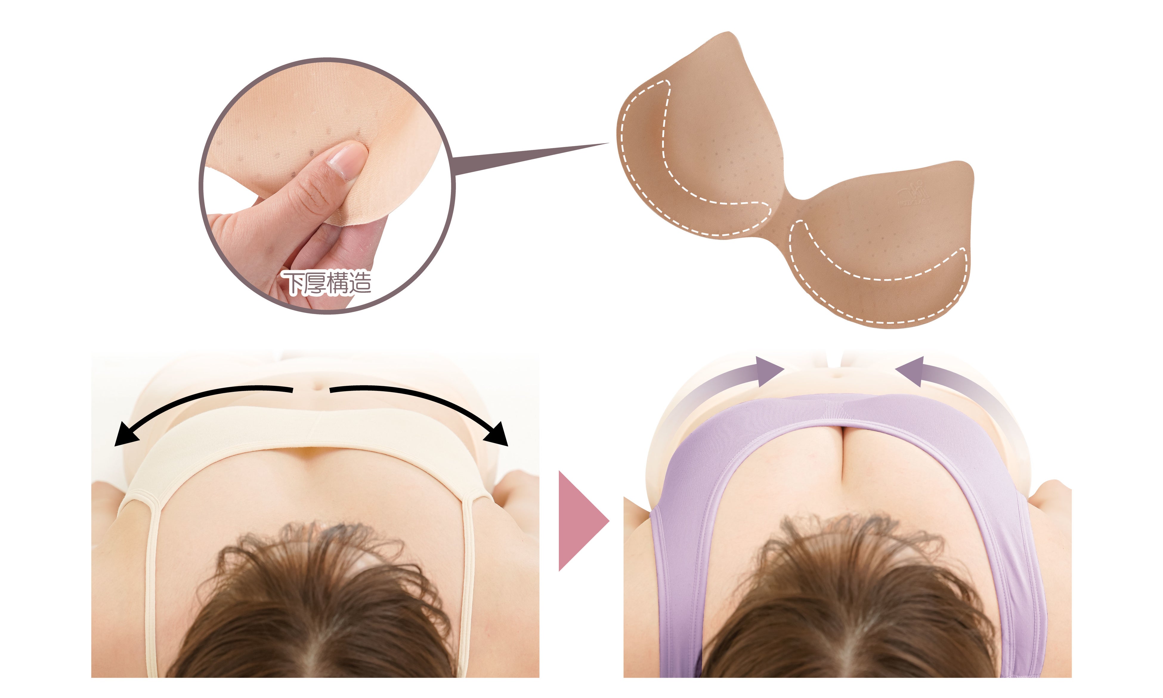 パッドのサイドと下側が厚めになっているので、ギュッと寄せ上げて丸みのあるバストへサポートします。
