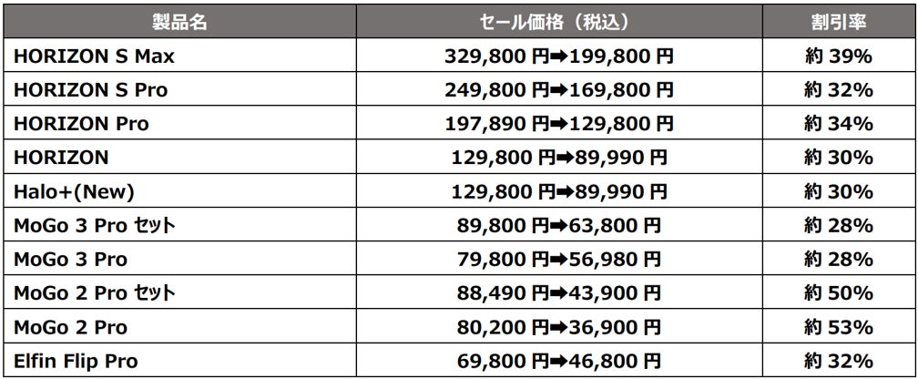 4Kホームプロジェクター「HORIZON」シリーズでは、昨年10月に発売した「HORIZON S」シリーズが最大39%OFFとお得にお求めいただけます。さらにポータブルプロジェクターの「MoGo」シリーズでは、最新モデルでスタンド一体型の「MoGo 3 Pro」が28%OFF、「Elfin」シリーズの最新モデルでバッテリー搭載かつわずか64mmのスリムボディが特徴の「Elfin Flip Pro」は32%OFFと、より手に取りやすい価格になっています。