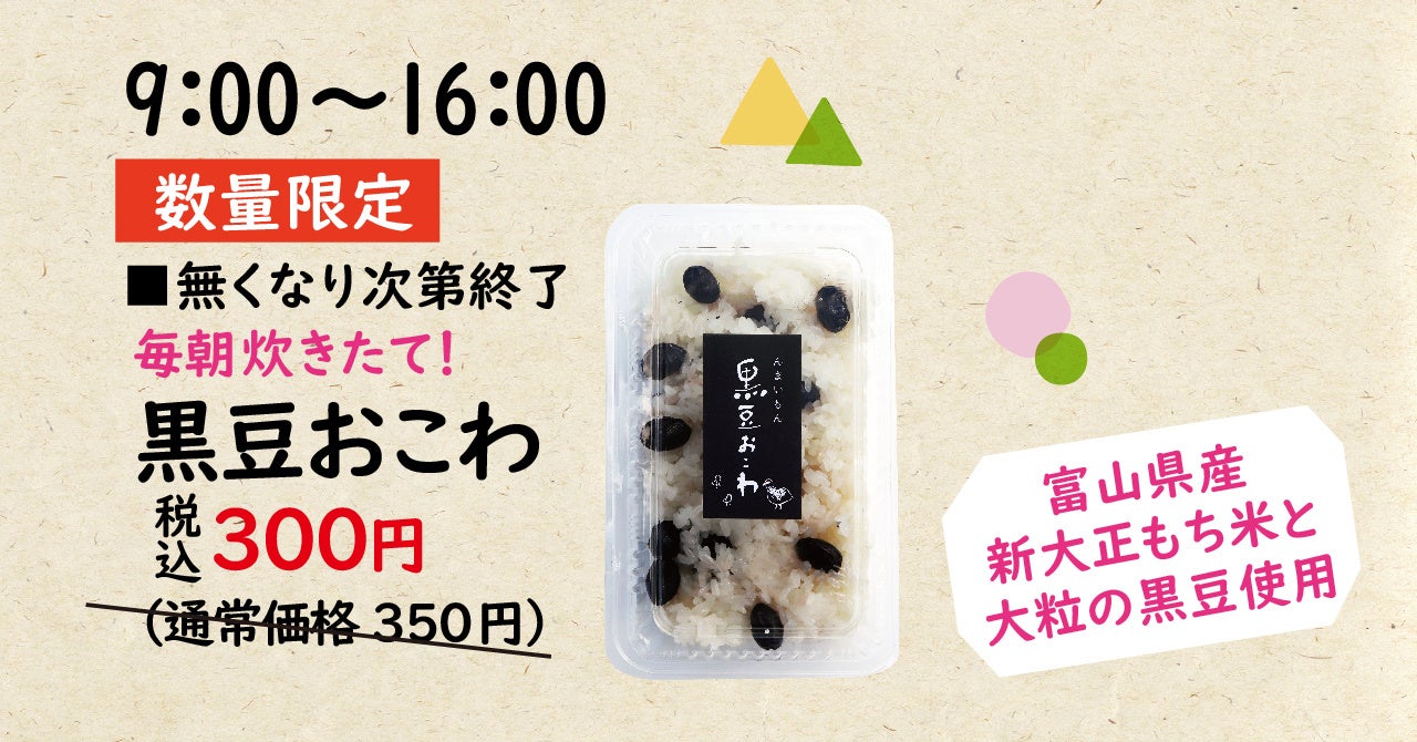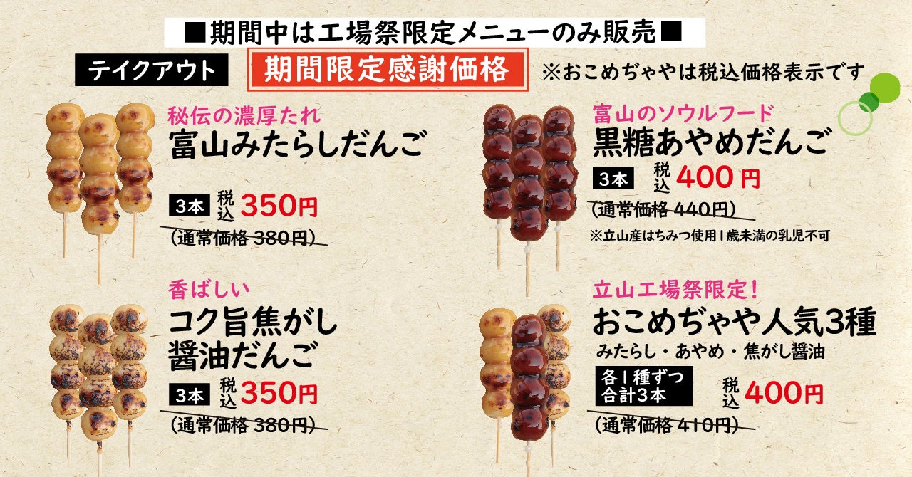 ささら屋立山本店内でだんごとおこわを販売する日の出屋製菓のおやつの新ブランド「おこめぢゃや」。連日多くのお客様にお買い求めいただく「富山みたらしだんご」や立山本店工場祭限定の人気だんご3種を楽しめる「おこめぢゃや人気3種」なども感謝価格で販売いたします。毎朝炊きたてでご用意する「黒豆おこわ」は数量限定販売。まだお召し上がりでない方は工場祭期間中に特別価格でお楽しみください!(※写真はイメージです)