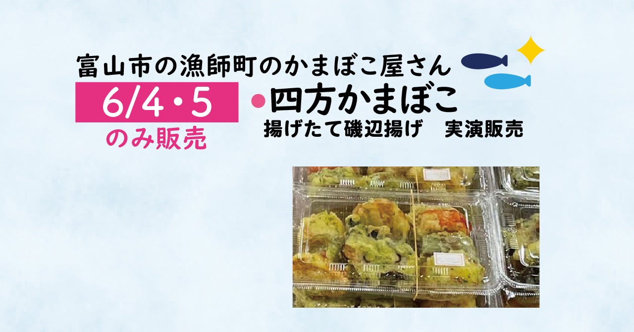 6月4・5日は、四方かまぼこ様による磯辺揚げの実演販売を予定しています。ぜひ揚げたての磯辺揚げをお楽しみください。