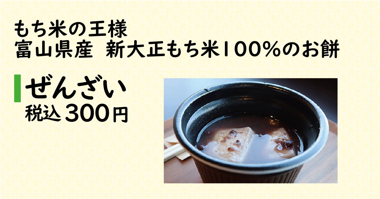 ささら屋立山本店の定番の楽しみ方といえば、立山連峰を眺めながら食べる「しろえびせんべいソフトクリーム」。しろえびせんべいを細かくくだいてバニラアイスに混ぜたお子様や女性に大人気のソフトクリームを、日頃の感謝の気持ちを込めて感謝価格で販売します。お餅好きの方には、新大正もち米100%のお餅を使用した温かい「ぜんざい」がおすすめです。