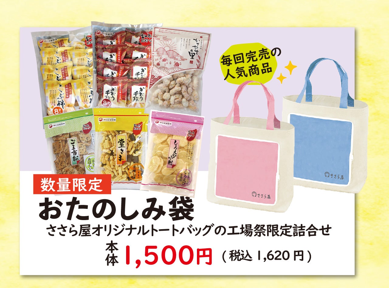 ささら屋オリジナルトートバックに米菓を詰め合わせた「おたのしみ袋」の数量限定販売や、ささら屋のおやつの定番8Pシリーズのおまとめ買い企画を行います。