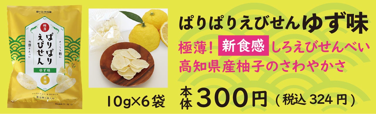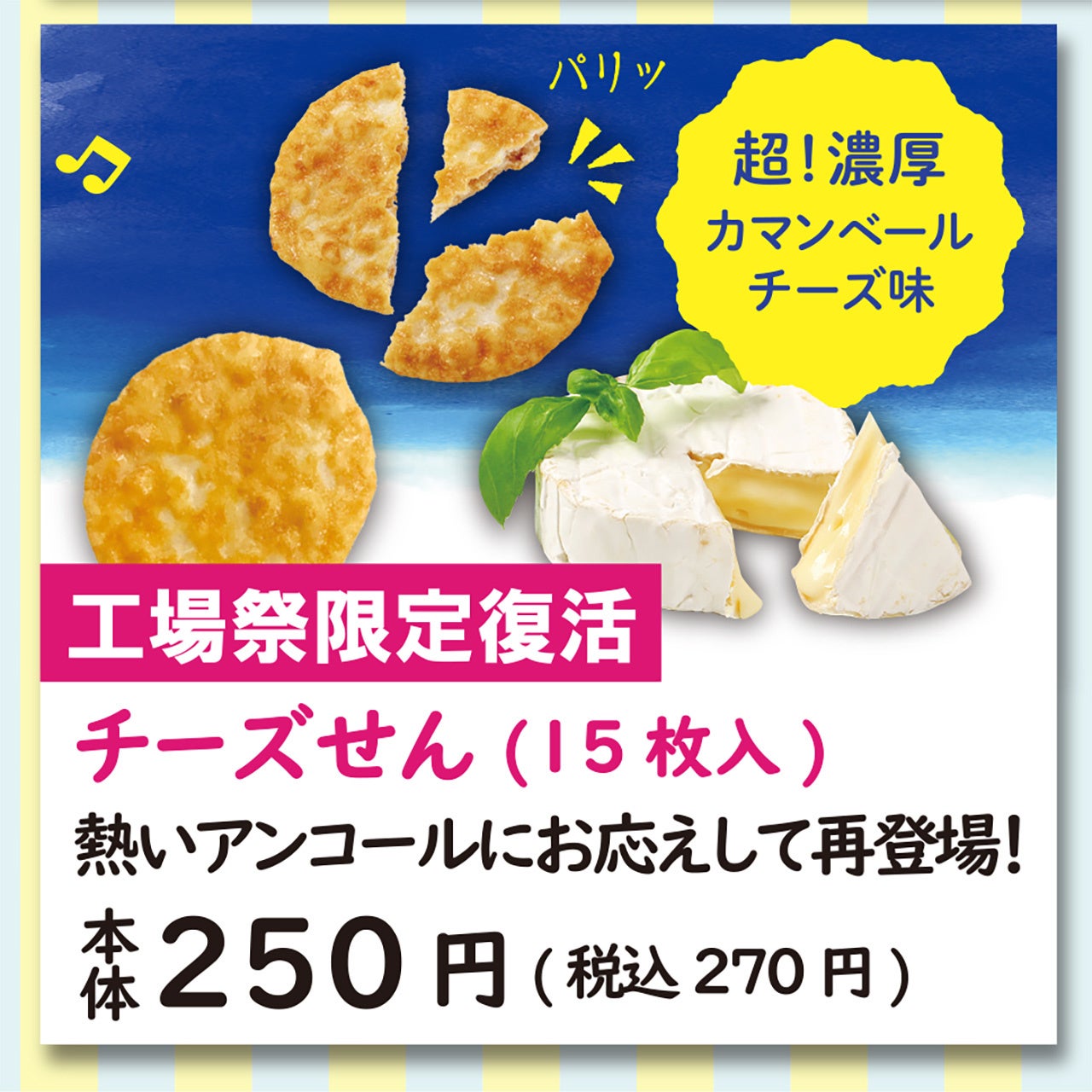 さらに、お客様のリクエストにお応えする企画として、濃厚カマンベールチーズ味がおつまみとして人気の「チーズせん」が工場祭限定復活!高知県産柚子を使用した爽やかな風味が楽しめる極薄しろえびせんべい「ぱりぱりえびえん ゆず味」も完売必至の限定商品です。
