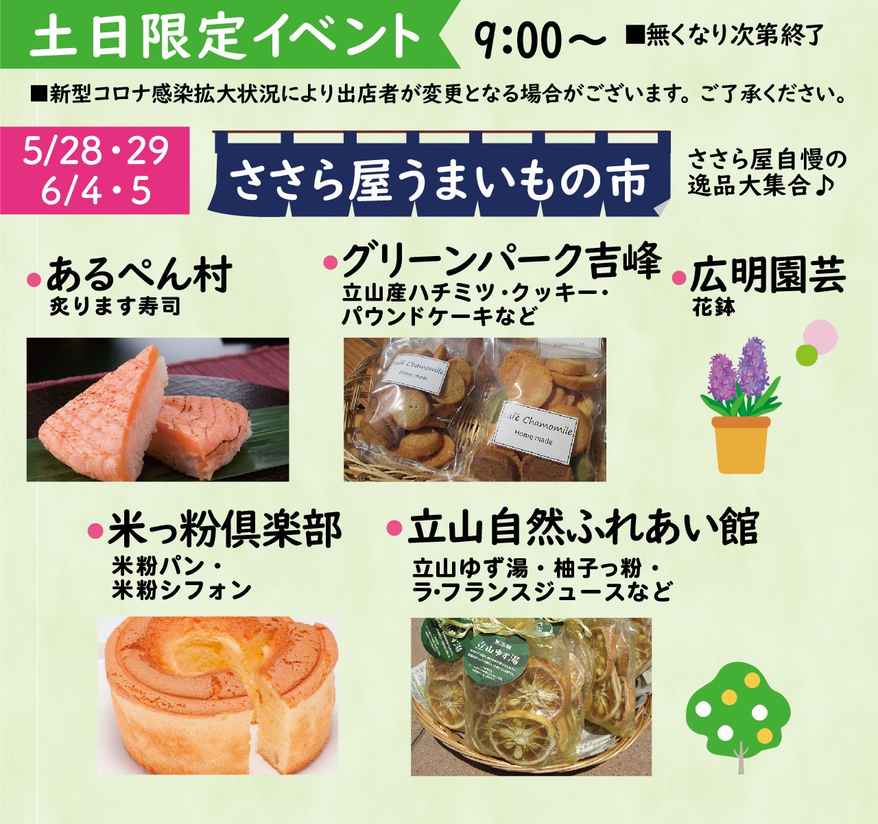 地域密着イベントの工場祭では、土日限定でささら屋がオススメする富山県内の逸品が集まる「ささら屋うまいもの市」を開催します。「県内のグルメが手軽に楽しめる」と毎回好評なマルシェ形式のイベントで、6月4日・5日には実演販売を予定しています。