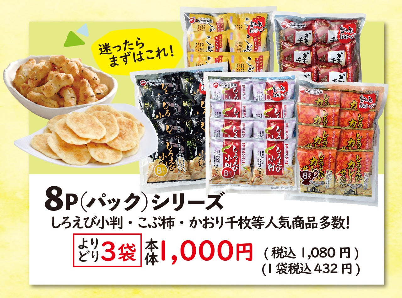 商品名:日の出屋製菓8Pシリーズ (しろえび小判・こぶ柿・かおり千枚、等)販売価格:よりどり3袋で1,080円(税込)※単品購入の場合は1袋432円(税込)