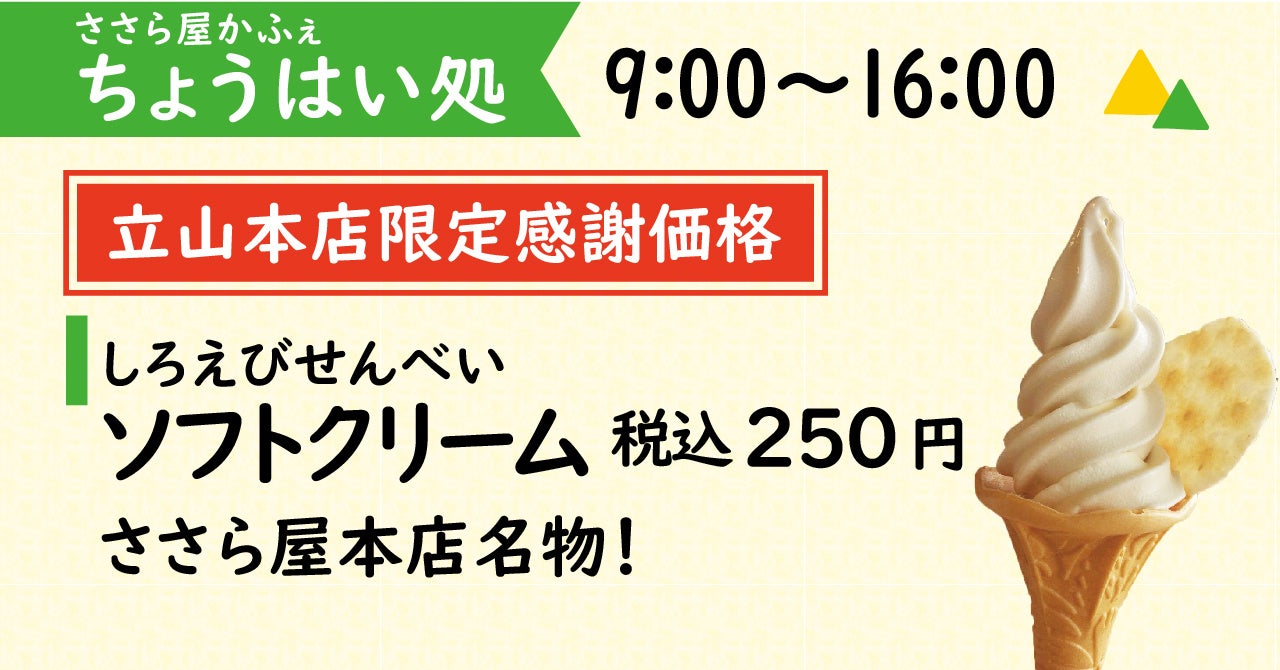 ささら屋本店名物の「しろえびせんべいソフトクリーム」を感謝価格で販売!富山県内の逸品グルメが集まる週末限定イベント「ささら屋うまいもの市」も同時開催