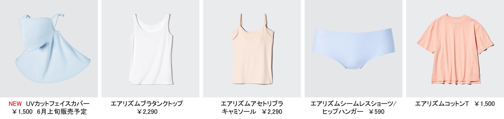 エアリズムはさまざまなシーンで快適にお過ごしいただけるよう、インナーのみならず、長袖やTシャツ、グッズまで、豊富なバリエーションを展開しています。今シーズンは、紫外線対策ができる「UVカットフェイスカバー」が新登場。エアリズム特有の滑らかな肌触りとドライ機能を備えながら、頬骨から首全体までをカバーするデザインにより、日差しの強い日も快適に紫外線対策をすることができます。ウィメンズエアリズムブラタンクトップはネックライン、フィット感、丈を見直すことでよりすっきり着られるデザインにアップデートしました。