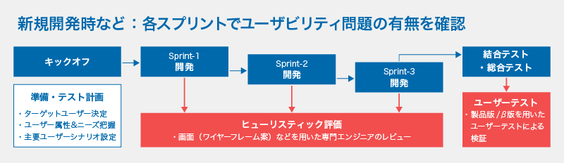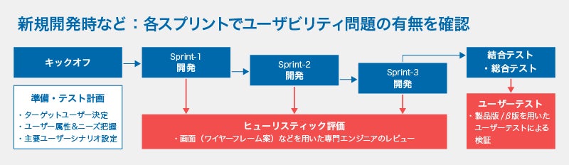 アジャイルによる新規開発では、各スプリントでユーザビリティの問題の有無を専門家が確認し、結合テストや総合テスト段階での被験者によるユーザーテストで、改善結果を検証することが可能です。