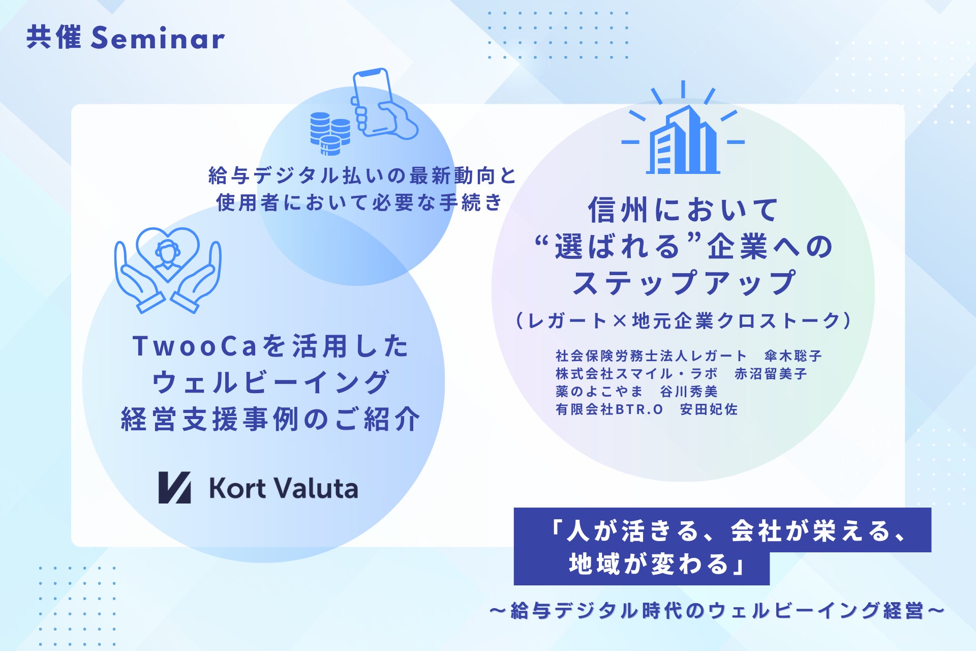 株式会社 Kort Valuta (本社:東京都渋谷区、代表取締役 柴田秀樹 以下、当社)は、社会保険労務士法人レガート(所在地:長野県松本市、代表:傘木聡子、以下「レガート」)と共同で、2026年2月19日(月)に長野県内の事業会社向けセミナー「人が活きる、会社が栄える、地域が変わる ~給与デジタル時代のウェルビーイング経営~」を開催することをお知らせいたします。