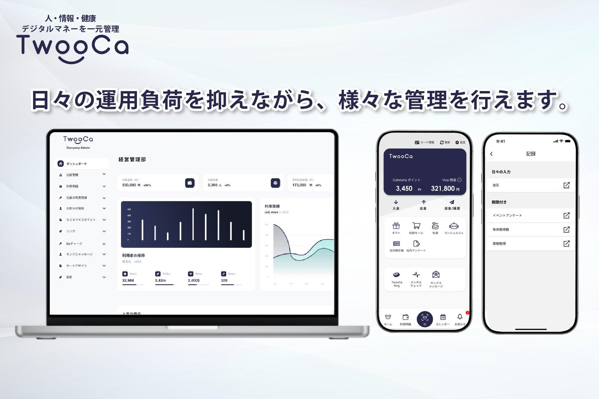またTwooCaは理念として、従業員や会員を大切にすることが、結果として導入企業や組織への価値向上につながり、業績の向上と従業員や会員のモチベーション向上を同時に実現するような持続可能なエコシステムを企業や組織 に根付かせることに繋がる、というビジョンに基づいて開発されました。「情けは人の為ならず(人を思いやる行動が、巡り巡って組織や社会の力になる)」という考え方を、テクノロジーによって具現化しています。