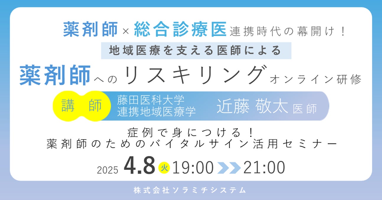 【ソラミチシステム:<PECS1単位>無料オンライン研修4月8日開催】地域医療を支える医師による、薬剤師へのリスキリングオンライン研修「症例で身につける!薬剤師のためのバイタルサイン活用セミナー」