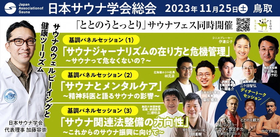 サウナに関する研究促進、正しいサウナ浴の啓発を通じて国民の健康増進に寄与することを目的に活動する日本サウナ学会(代表理事・加藤容崇)が主催となり開催される「日本サウナ学会総会」。リアル開催2回目となる今年は「ととのうとっとり」を掲げ、サウナを軸とした観光誘客を推進する鳥取県が開催地に選ばれました。当日は「サウナジャーナリズムのあり方と危機管理」「サウナとメンタルケア」「サウナ関連法整備の方向性」の3テーマでパネルセッションを行います。