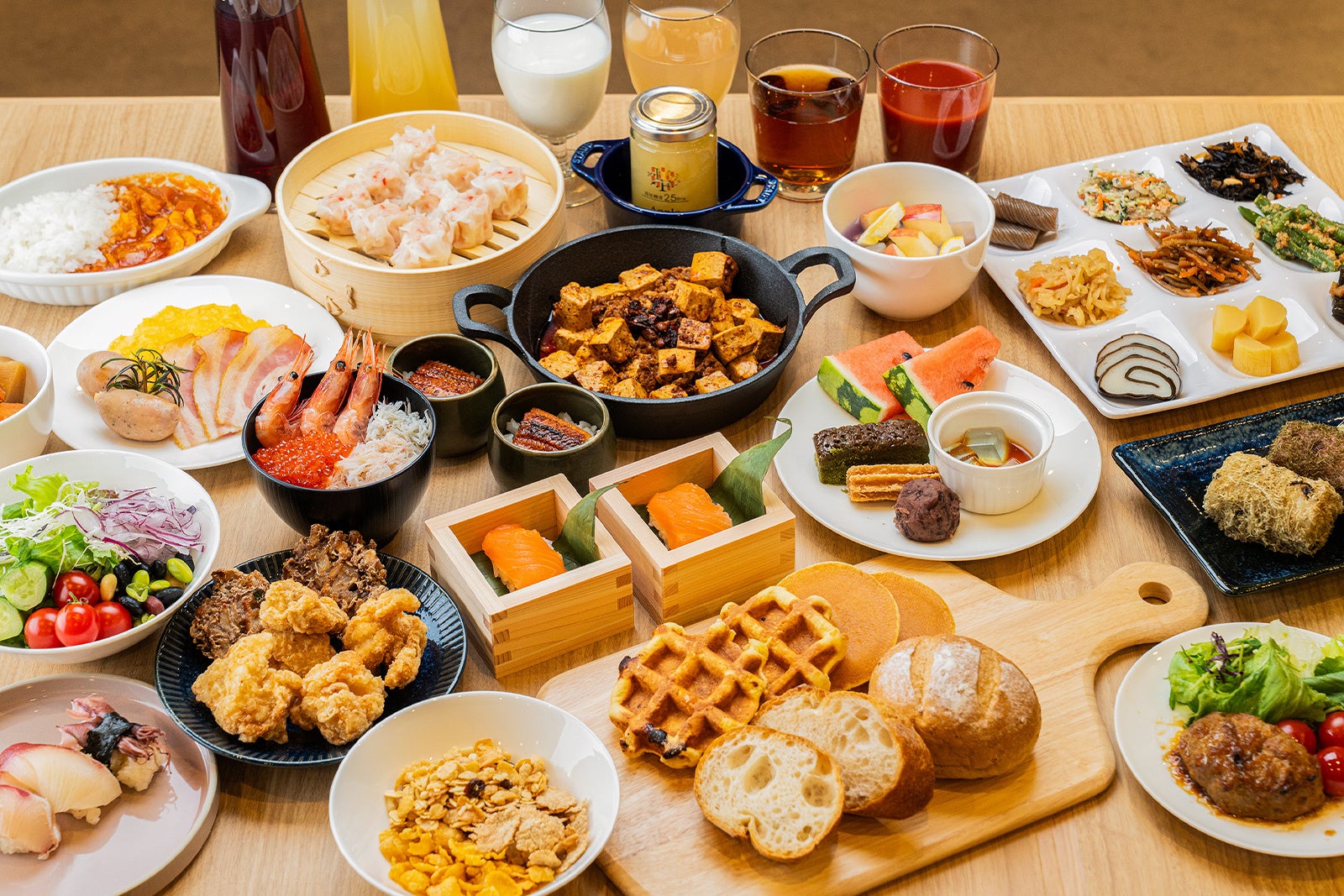 一日の始まりを豊かに彩る朝食ブッフェでは、富山湾や立山連峰に囲まれたこの土地ならではの旬の味覚をお楽しみいただけます。名物の「ます寿司」や「白エビ」、「ほたるいか」を使った料理など、地元の恵みを活かしたメニューが並び、朝から富山らしい味わいに出会えるひととき。温かい郷土料理「たら汁」や地元産コシヒカリのご飯、ご当地グルメ「富山ブラックカレー」もご用意し、旅の疲れを癒す滋味深い味わいをお届けいたします。さらにライブキッチンでは、シェフが目の前で仕上げるオムレツや焼き立てのお料理をご提供。ホテルエノエ富山の朝食ブッフェは、これまで多くのお客様からご好評をいただいており、旅のスタートを心地よく迎えていただける内容に仕上げております。できたての香りと音に包まれながら、富山の魅力を五感で味わうひとときをお楽しみください。