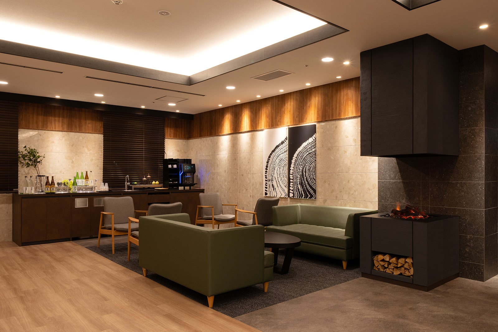 木の温もりを基調とした上質なデザインのロビー・ラウンジには、柔らかな炎が揺れる暖炉を設け、落ち着きと華やぎが調和する空間を演出。富山の銘酒や香り高いコーヒーをフリードリンクで楽しみながら、ゆったりと流れる時間をお過ごしいただけます。朝は光あふれる明るい空間として、夜は暖炉の灯が静かに瞬く憩いの場として、滞在のすべての瞬間を心地よく彩ります。
