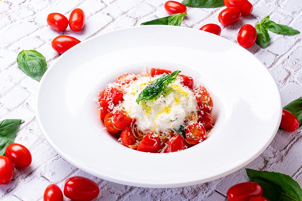 【メニュー名】北海道産プレミアムミニトマト「純あま」とフレッシュモッツァレラチーズの冷製スパゲティ