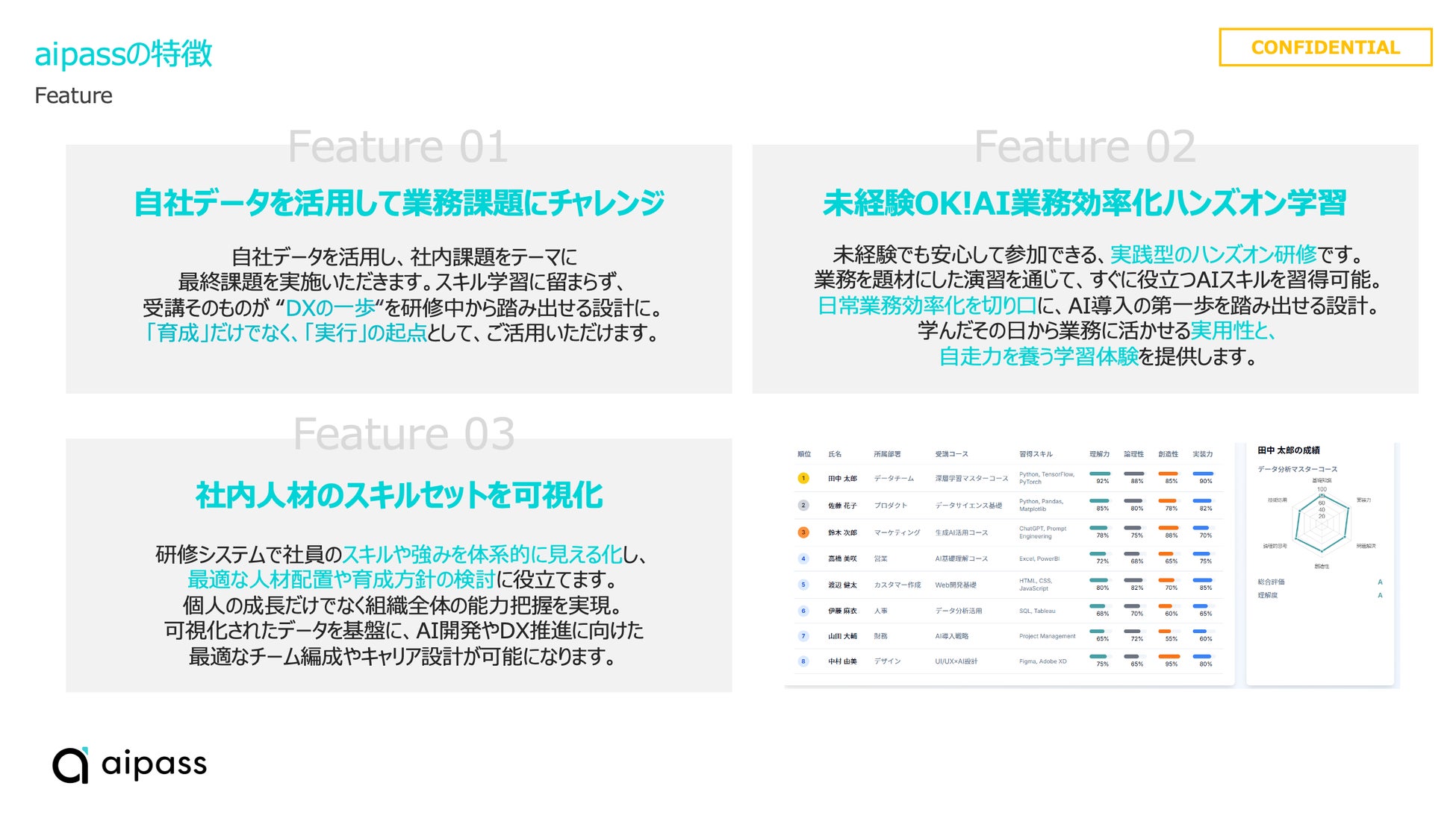 教育分野では、企業のAI・DX推進を支援する法人向け研修プログラム「AIパス」「AIパス Light」を展開しています。