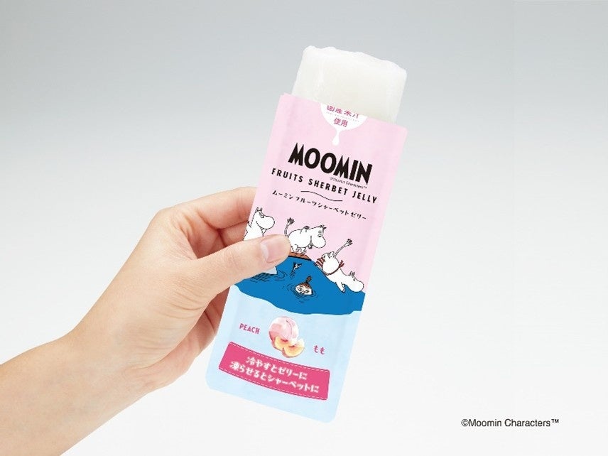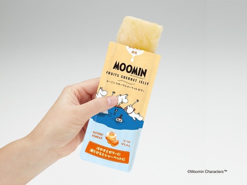本商品は、今年の夏をムーミンの商品と一緒に楽しく元気に過ごしてほしいという想いで開発した夏期限定商品です。国産果汁を使用したシャーベットゼリーで、常温時はゼリーとして、凍らせるとシャーベットとして、二通りの食べ方を楽しむことができます。パッケージは夏らしく、水辺で遊ぶムーミンのイラストに、夏らしい爽やかなカラーリングのデザインを施しました。