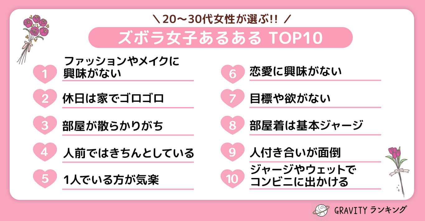 【GRAVITYランキング】20代〜30代女性が選ぶ!!「ズボラ女子あるあるTOP10」