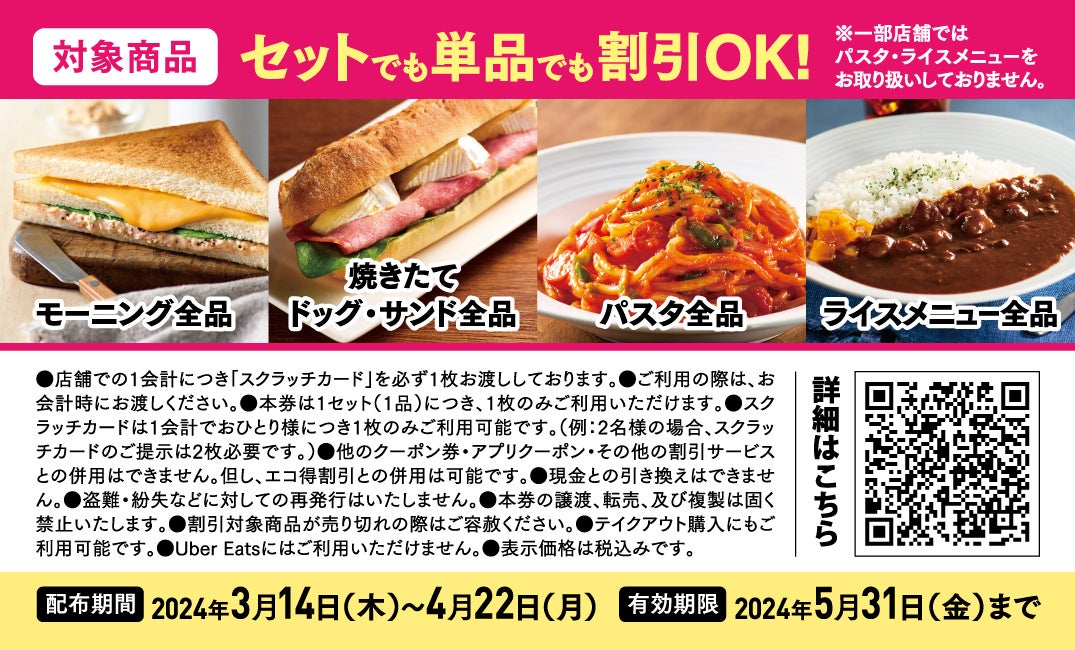 この春のお得なキャンペーンでは、店舗での1回のお会計毎に、ハズレ無しの割引スクラッチカードを1枚プレゼント。モーニング、焼きたてドッグ&サンド、パスタ、ライスの全メニュー計15品(新メニュー含む)が、次回ご購入時最大200円引きとなります。例えば、ドリンク付きのセットに200円OFFのスクラッチカードをご利用いただいた場合、モーニングセットは280円~※、11時以降のフードセットは420円~とお得にご購入いただけます。