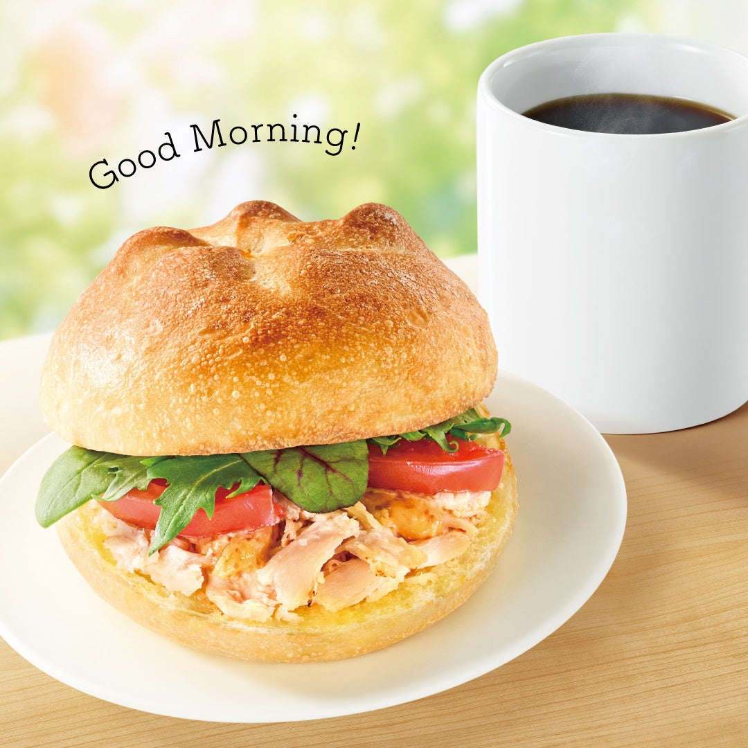 人気のカイザーパンを使用した「モーニング」と、香ばしい全粒粉入りのパンに具材を挟んで焼き上げる「焼きたてサンド」に新メニューが登場。『モーニングB カイザーサンド サラダチキン~すりおろし野菜ソース〜』は、やわらかい鶏むね肉のサラダチキンとフレッシュなトマトに、野菜の旨みが詰まったソースをあわせた朝の特別メニューです。「焼きたてサンド ハニーマスタードチキン」は、しっかりと薫香をつけたスモークチキンやサラダほうれん草やトマトを挟み、マイルドなハニーマスタードソースをあわせました。
