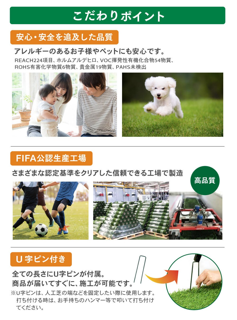 U字ピンは人工芝をしっかり固定し、遊んでいる最中にズレたり、風で飛ばされないようにするために必要です。ピンの大きさに合わせて数をご用意しましたので、別途ホームセンターに行く必要はありません。