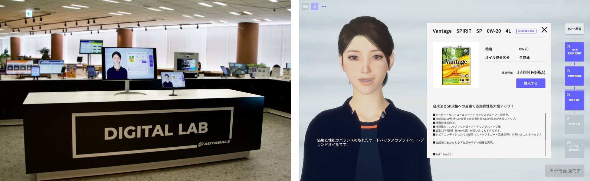 デジタルラボにご来訪された方に、タブレットを用いて「レイチェル」による接客を体感・体験していただける模擬環境を提供します。具体的な内容は以下のとおりです。 ・車種、購入履歴、在庫状況、価格、商品の特徴などを基に、お客様に適切な商品を推奨することによる選択のサポート。 ・車種適合やPIT予約、エンジンオイル交換などの定期的な付随作業を含む必要なプロセスへのスムーズな誘導。 |