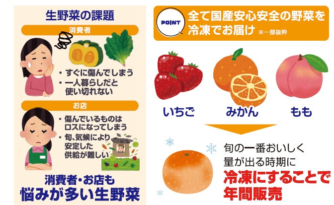 2024年問題により新鮮な青果物の流通に課題が生じていることや青果物ロスへの対策提案として、新技術である青果物への冷凍技術を展示いたします。