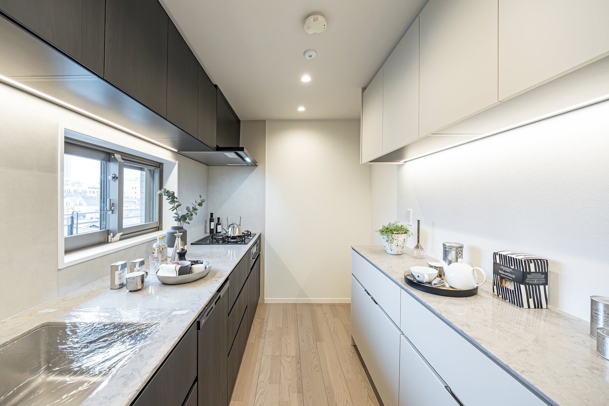 中古マンションだからこそ手に入れられた、十分な広さと大きなルーフバルコニーを備えた物件をホテルライクにリノベーションした事例。生活動線の良い3LDKの間取りや折り上げ天井など既存の部分も活かしながら、リノベーションにより内装デザインを一新。キッチンの背面には和モダンなホテルをイメージした木の縦格子をあしらい、ひとつの家具のような存在感を出しています。さらに、玄関や廊下、洗面室、キッチンの天井や壁はグレーのタイルや黒のクロスを締め色として採用し、明暗のメリハリある空間に仕上げました。